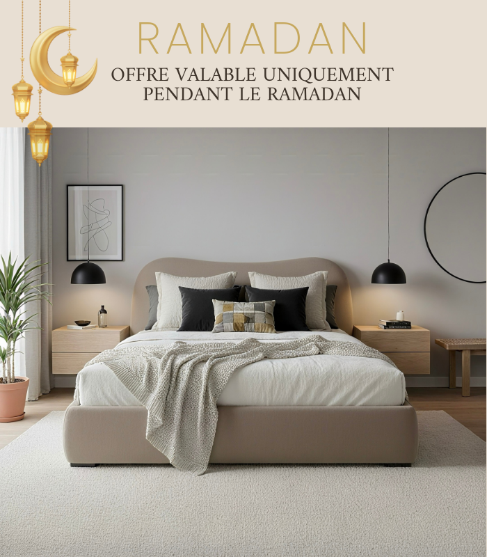 Tête de lit arrondie en tissu design. Le lit Coccon transforme votre chambre à coucher en cocon de confort et d’élégance.